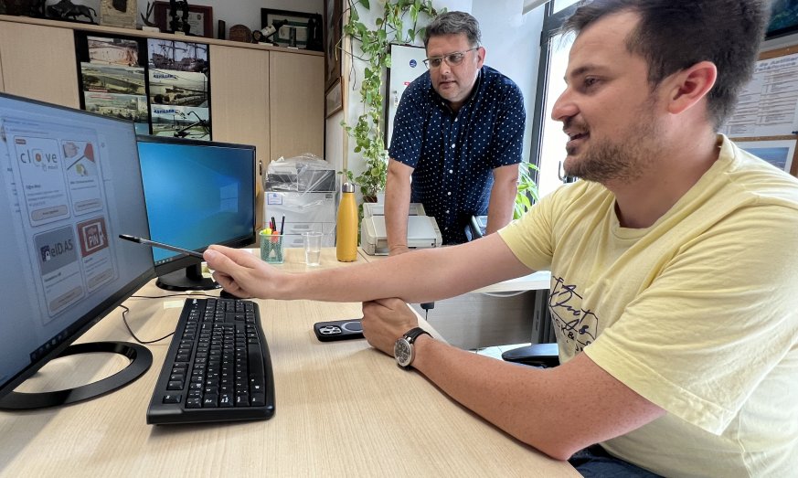 Astillero, 10 de julio de 2024. El alcalde de Astillero, Javier Fernández Soberón, y el presidente del Unión Club de Astillero, Estiven Edzang Picado, han firmado el convenio de colaboración mediante el cual, el club se convierte en usufructuario del campo de fútbol municipal, permitiéndole gestionar los derechos de uso y haciéndose cargo del mantenimiento diario de la instalación.