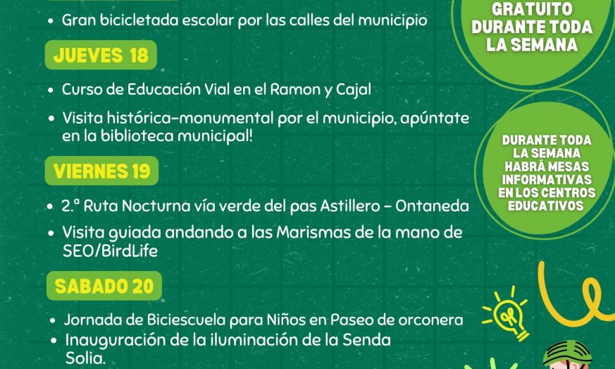 La programación combina cursos de educación vial, una bicicletada escolar, visitas histórico-monumentales y una ruta nocturna en bici, además de actividades familiares como la Biciescuela para niños. A lo largo de toda la semana, los concejales del municipio dinamizarán mesas informativas itinerantes en centros educativos, donde preguntaran a las familias como mejorar la seguridad y movilidad de esos entornos.