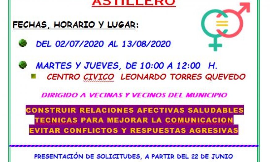 Astillero, sábado 20 de junio de 2020.  El Ayuntamiento de Astillero pone en marcha a partir del jueves 2 de julio unos Talleres sobre igualdad de género y relaciones saludables. Los interesados puedes inscribirse en el departamento de Servicios Sociales a partir de este próximo lunes 22 de junio. Están subvencionados con la financiación recibida en los ayuntamientos a través del Pacto de Estado contra la Violencia de Género.