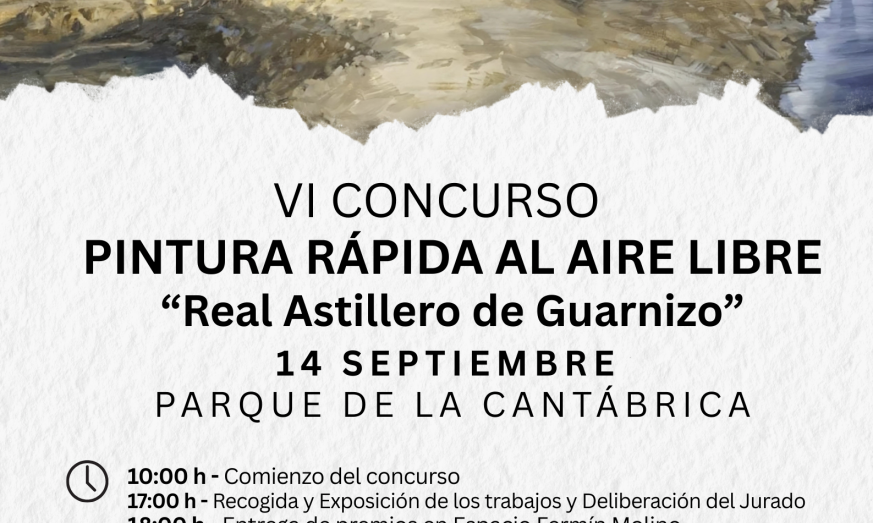 Las inscripciones para participar en el VI Certamen de Pintura Rápida al aire libre ‘Real Astillero de Guarnizo’ ya están abiertas. El Ayuntamiento de Astillero, a través de la Concejalía de Cultura, convoca una nueva edición de este certamen, cuya jornada se desarrollará el 14 de septiembre de 10:00 a 17:00 horas, con sellado de soportes de 9:00 a 10:00 horas en el Espacio Fermín Molino (Plaza del Mercado). Allí también se entregarán las obras hasta las 17:00 horas.